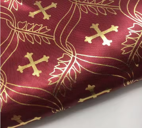 FS15 red color custom satin fabric with cross flower gold stamping print for casket decoration
